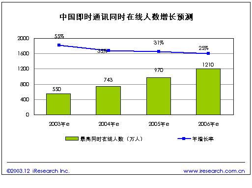 我們預(yù)計未來隨著中國上網(wǎng)人口的增長,以及IM軟件的不斷普及,即時通訊在線人數(shù)將保持快速增長。預(yù)計2004年國內(nèi)IM最高同時在線人數(shù)有望突破740萬人,到2006年將突破1200萬人同時在線。
