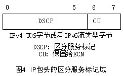 DS標(biāo)記域定義為IPv4頭部的TOS(Type of Service)字節(jié)或IPv6頭部的流類型(Traffic Class)字節(jié)。如圖4所示。其中DSCP(6bit)即為區(qū)分服務(wù)標(biāo)記,CU(2bit)在本體系中沒(méi)有使用,IETF已將它定義為ECN(Explicit