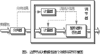 計(jì)量器根據(jù)TCA中所規(guī)范的業(yè)務(wù)流要求測(cè)量被分類器所選定的業(yè)務(wù)流的某些實(shí)時(shí)屬性,并將所測(cè)量到的數(shù)據(jù)包的統(tǒng)計(jì)信息送往其它的調(diào)節(jié)功能模塊。