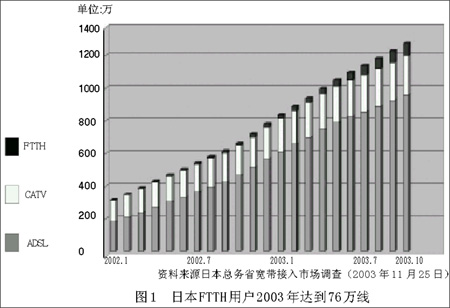 從現(xiàn)狀看,在亞洲發(fā)展FTTH比較迅速的是日本和韓國,早在20世紀(jì)90年代初期日本就制定了雄心勃勃的計劃:2010年使光纖進入全國家庭。2001年以來,日本FTTH市場進入快速增長階段:2001年只有usen和NTT東日本、NTT西日本幾家公司,而到2002年7月,已經(jīng)有9家公司提供FTTH業(yè)務(wù)。據(jù)日本總務(wù)省統(tǒng)計,到2004年7月,日本FTTH用戶數(shù)已經(jīng)突破130萬,預(yù)計在2005年達到450萬。