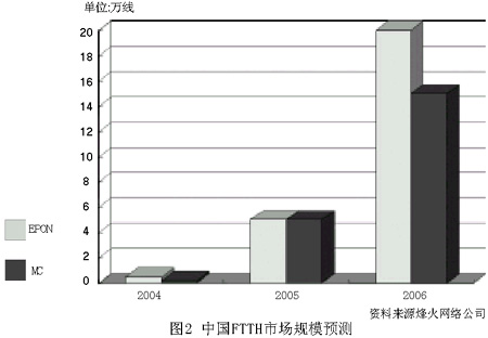 FTTH建設(shè)在中國已經(jīng)開始啟動,部分運營商已經(jīng)試用了一些廠商設(shè)備(例如烽火網(wǎng)絡(luò)的EPON設(shè)備)進行試點工程的建設(shè),數(shù)年內(nèi),運營商將會進行選型工作,進行小批量的建設(shè)。隨著設(shè)備價格的逐步下降,建設(shè)量將會逐步加大,預(yù)計在2至3年內(nèi)成為主要的接入手段。部分駐地運營商以及房地產(chǎn)商也開始對FTTH技術(shù)產(chǎn)生濃厚的興趣,積極與運營商合作開發(fā)FTTH建設(shè)。