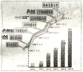 正是憑借著這些優(yōu)勢,即時(shí)通信吸引聚集著一些忠誠用戶,并開始搭建網(wǎng)絡(luò)廣告、無線增值等一系列各種潛在的交易平臺(tái)?梢韵胂,一個(gè)絕佳的聊天窗口同時(shí)也是一個(gè)方便的交易窗口和暢通的付費(fèi)入口,即時(shí)通信正在摸索一條前所未有的盈利模式。有專家指出,經(jīng)過近5年的曲折前行,即時(shí)通信的盈利模式將在2005年逐步明確。以騰訊QQ為例,我們來剖析一下即時(shí)通信的盈利模式是如何由模糊走向清晰的。從1999年2月QQ發(fā)布到2000年5月,QQ迅速聚攏了10萬用戶。2000年8月,騰訊公司同廣東移動(dòng)合作,僅僅用了一年就扭虧為盈,實(shí)現(xiàn)了1000萬人民幣的純利潤。