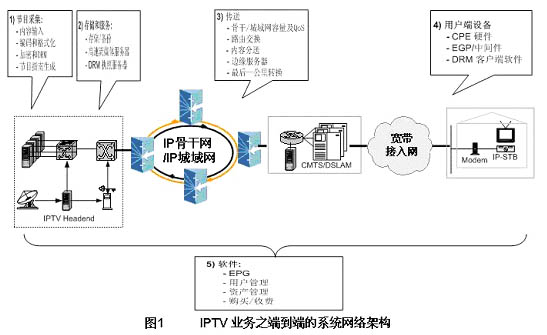IPTV系統(tǒng)技術(shù)能用來提供將視音頻流媒體節(jié)目,如IP電視節(jié)目,從節(jié)目中心(first mile)播出,并通過骨干網(wǎng)、城域網(wǎng)和寬帶接入網(wǎng)(last mile)傳輸,直到被用戶接收之端到端的完整技術(shù)解決方案。一個(gè)端到端的IPTV系統(tǒng)一般具有節(jié)目采集、存儲和服務(wù)、節(jié)目傳送、用戶終端設(shè)備和相關(guān)軟件等五個(gè)功能部件。