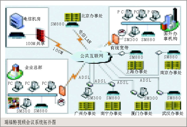 。。 本系統(tǒng)中包含多個(gè)會(huì)場(chǎng),使用瑞福特SM 880硬件終端,每個(gè)會(huì)場(chǎng)采用單獨(dú)的ADSL接入(也可采用其他接入方式),能夠保證發(fā)送與接收320×240、25
