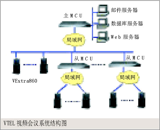 。。 圖中各會(huì)議節(jié)點(diǎn)均配置一臺(tái)VTEL VExtra視頻會(huì)議終端,通過E1電路接入網(wǎng)絡(luò)中心的Meta