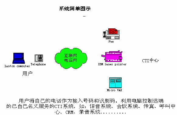 利用用戶現(xiàn)正使用的電話,利用呼叫轉(zhuǎn)移功能與CTI中心連接,為用戶提供以用戶為中心的、個(gè)性化的語音服務(wù)系統(tǒng)。以此增加電信增值業(yè)務(wù),提高電話的有效接通率,提高電信運(yùn)營商的效益。