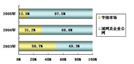 2004年,基于專線網(wǎng)絡(luò)的視頻會(huì)議系統(tǒng)與基于混網(wǎng)和企業(yè)公網(wǎng)的產(chǎn)品比例發(fā)生了轉(zhuǎn)折性變化,基于混網(wǎng)和企業(yè)公網(wǎng)的產(chǎn)品占到了68.8%的比例,成為了市場主流。計(jì)世資訊(CCW Research)研究表明:2005年,這一趨勢更趨明顯,基于混網(wǎng)和企業(yè)公網(wǎng)產(chǎn)品的比例將高達(dá)87.5%。