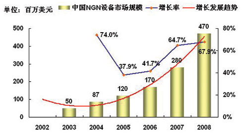 2005年全球?qū)τ贜GN的基礎(chǔ)實施的建設(shè)將會進入快速啟動期,而2005年以后中國的NGN的市場將進入黃金發(fā)展時期。