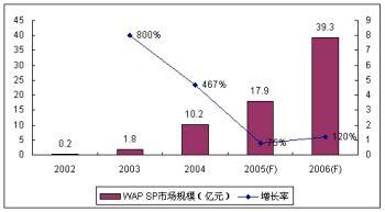 2005年中國運營商對WAP沉默用戶的清理和一系列內(nèi)容監(jiān)管措施使得WAP市場前兩年的高速增長勢頭減緩,SP市場規(guī)模增長率下探至75%,規(guī)模達(dá)17.9億元。諾盛預(yù)計由于運營商監(jiān)管政策的連續(xù)性及其對免費WAP網(wǎng)站的政策調(diào)整,2006年的WAP市場仍然無法恢復(fù)2004年以前的高速增長勢頭,但增長率略有回暖,達(dá)到120%。