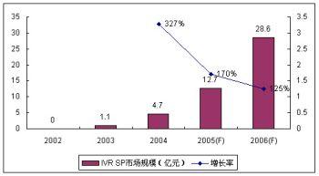 由于運營商的監(jiān)管和增量市場需求的減少,2005年IVR高速增長的勢頭有所回落,市場增長速度趨于理性,SP市場份額增長率為170%,整體SP市場份額達(dá)到12.7億元。諾盛預(yù)計2006年IVR市場增長率將繼續(xù)回調(diào),但絕對增長率仍然較快,達(dá)到125%。