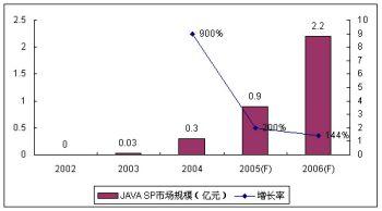 作為SP和移動運營商都非常看好的業(yè)務(wù),JAVA業(yè)務(wù)受到眾多SP的青睞。盡管作為JAVA主要業(yè)務(wù)的手機(jī)游戲目前盈利狀況普遍欠佳,但空中網(wǎng)、美通無線、數(shù)字魚等SP仍然大量投入,期待著未來業(yè)務(wù)的高速增長。受制于終端和JAVA游戲的表現(xiàn)力,2005年JAVA業(yè)務(wù)的SP市場規(guī)模增長率回落到200%,諾盛預(yù)計2006年JAVA的使用環(huán)境沒有太大變化,其增長率進(jìn)一步回落至144%。