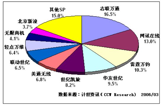 計世資訊(CCW Research)數(shù)據(jù)顯示:從各SP的收入構(gòu)成來看,IVR業(yè)務的市場集中度非常高。以中國聯(lián)通為例,收入前10位的SP有:志聯(lián)萬通、網(wǎng)訊在線、雷霆萬鈞、華友世紀、世紀凱旋、美通無線、聯(lián)動世紀、輕點萬維、無限商機、北京新浪,他們的總收入占到聯(lián)通全部IVR業(yè)務收入的85%。
