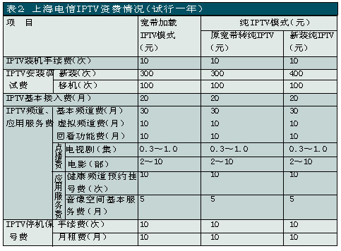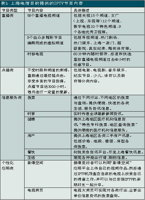 上海電信是國內(nèi)關(guān)注并切入IPTV業(yè)務(wù)較早的電信運(yùn)營商之一,自2005年就開始積極測(cè)試和試驗(yàn)。此次上海電信在全上海市范圍內(nèi)推出IPTV業(yè)務(wù),被業(yè)界看作是“中國IPTV規(guī)模商用的新紀(jì)元”。除了影視節(jié)目收看、視頻內(nèi)容點(diǎn)播、時(shí)移功能外,上海電信的IPTV服務(wù)還包括時(shí)事新聞、遠(yuǎn)程醫(yī)療、視頻房產(chǎn)信息、餐飲信息、天氣預(yù)報(bào)、票務(wù)查詢等信息服務(wù)以及可視電話、IPTV游戲等個(gè)性化應(yīng)用。其中IPTV的直播頻道有58個(gè),視頻點(diǎn)播可選節(jié)目量達(dá)3000小時(shí)以上。另外,上海電信還推出了影像空間和電視大黃頁等應(yīng)用服務(wù),攝像愛好者可以利用“影像空間”應(yīng)用平臺(tái)上傳自己的視頻作品,然后通過IPTV機(jī)頂盒在自家的電視上欣賞自己的得意之作,并可以與已安裝IPTV的親朋好友一起分享;電視大黃頁可實(shí)現(xiàn)對(duì)各類行業(yè)、企事業(yè)單位信息資訊的搜索查詢。