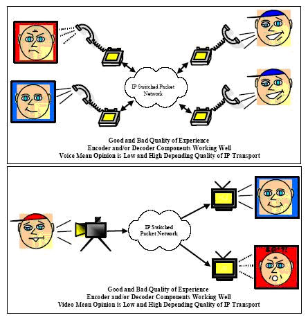 自然地,人們會(huì)向到將MOS或其它基于判斷的分值測量技術(shù)應(yīng)用于IP業(yè)務(wù)的質(zhì)量體驗(yàn)測量。對于IP業(yè)務(wù),業(yè)務(wù)提供商的控制力是有限的,攜帶語音和視頻信息的數(shù)據(jù)包進(jìn)入IP網(wǎng)絡(luò)后,IP業(yè)務(wù)提供商能做的僅僅丟棄數(shù)據(jù)包、延遲數(shù)據(jù)包或者將數(shù)據(jù)包重新排序。