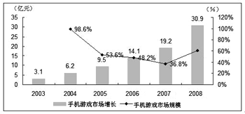 國內手機游戲市場在過去的幾年里呈現(xiàn)快速發(fā)展的趨勢。2004年增長率接近100%,2005年也有50%以上的增長。但最近兩年國內整個手機游戲市場隨著手機普及率的增速放緩也進入了盤整期。iResearch咨詢估計,從2005年至2007年,國內手機游戲市場的收入規(guī)模盡管仍然處于上漲趨勢,但年增長率逐年下降,2008年后隨著市場環(huán)境更加成熟理性,年增長率將會出現(xiàn)反彈,升至60%以上。