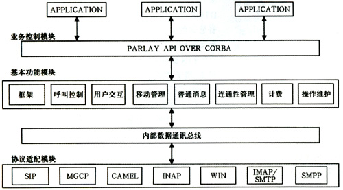 從結(jié)構(gòu)上看,Parlay網(wǎng)關(guān)分為協(xié)議適配模塊(ProtocolAdapter),基本功能模塊(BasicFunction),業(yè)務(wù)控制模塊(ServiceControl)等三個(gè)功能模塊,如圖2。