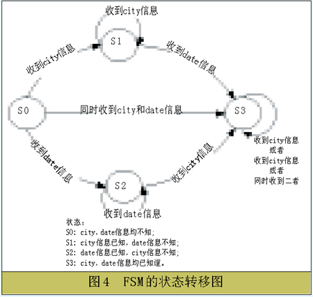 在總結(jié)了前人工作經(jīng)驗和結(jié)合本系統(tǒng)的實際問題的基礎(chǔ)上,我們在對話管理的具體實現(xiàn)上,將框架理論和有限狀態(tài)自動機理論相結(jié)合,完成了一個智能的對話管理模塊。我們先將對話管理限制在天氣查詢領(lǐng)域。在系統(tǒng)中,通過人機之間的對話和確認,系統(tǒng)需要得到要查詢的時間和地點信息之后反饋查詢結(jié)果。