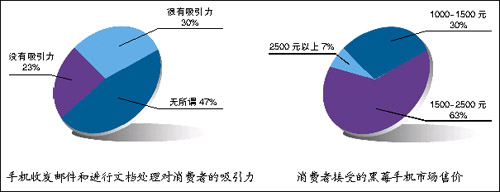 而根據(jù)調(diào)查結(jié)果,國內(nèi)消費者對于黑莓手機市場售價的普遍接受范圍在2500元以下。有63%的消費者認(rèn)為黑莓手機應(yīng)該在1500-2500元,30%的消費者認(rèn)為可以在1000元到1500元之間,只有7%的人認(rèn)為黑莓手機售價應(yīng)當(dāng)超過2500元。