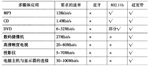 2.0接口相當,遠遠高于無線局域網(wǎng)802.11b的11 Mbit/s,也比下一代無線局域網(wǎng)802.11a/g的54 Mbit/s高出近一個數(shù)量級。UWB通信的功耗較低,能更好地滿足使用電池的移動設(shè)備的要求。另外,UWB信號的功率譜密度非常低,信號難以被檢測到,再加上采用的跳頻、直接序列擴頻等擴頻多址技術(shù),使非授權(quán)者很難截獲傳輸?shù)男畔,因而安全性非常好。?是一些典型的實時多媒體應用對不同無線傳輸技術(shù)的數(shù)據(jù)傳輸速率的要求。從表中可以看出,如果采用無線的方式來進行傳輸,只有UWB技術(shù)可以滿足各種應用的要求。