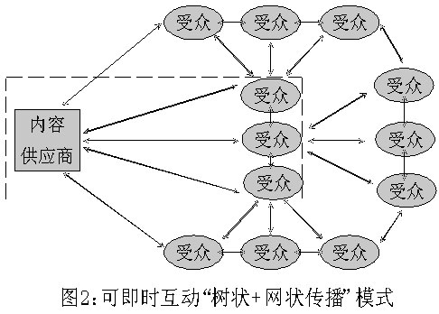 從傳播學(xué)角度分析,傳統(tǒng)媒體傳播方式是“樹狀傳播”,是點(diǎn)對面的單向傳播,即從一個(gè)信息源(樹根)向受眾(樹葉)作單向傳播(見圖1)。受眾(樹葉)向信息源(樹根)的反饋,是滯后的、非同介質(zhì)的(讀者來信、來電等),傳播和反饋不能同步進(jìn)行。而新媒體的傳播方式則是“網(wǎng)狀傳播”,即它是一個(gè)漁網(wǎng)式的傳播網(wǎng),網(wǎng)上的任意一個(gè)節(jié)點(diǎn),都可以向其他任意一個(gè)節(jié)點(diǎn)或節(jié)點(diǎn)群作點(diǎn)對點(diǎn)、點(diǎn)對面的單向或雙向互動式傳播,傳播者和受眾之間可以即時(shí)互動,信息反饋可以即時(shí)進(jìn)行,傳和受的位置可以即時(shí)互喚。