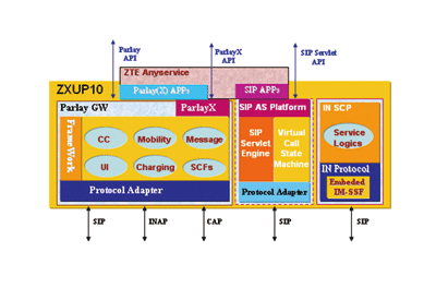 ZXUP10作為開(kāi)放業(yè)務(wù)平臺(tái),包括Parlay網(wǎng)關(guān)和SIP應(yīng)用平臺(tái),對(duì)外提供標(biāo)準(zhǔn)的Parlay/ParlayXAPI和SIPServletAPI,屏蔽底層網(wǎng)絡(luò)的差異性,第三方通過(guò)調(diào)用標(biāo)準(zhǔn)接口,快速生成Web等方式的第三方應(yīng)用,帶來(lái)業(yè)務(wù)開(kāi)發(fā)、提供模式的重大改變。