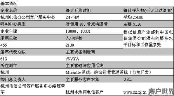 浙江省電信有限公司杭州市分公司客戶服務(wù)中心(以下簡稱杭州電信客服中心,或者杭州電信10000號)成立于2002年9月,是一個基于CTI技術(shù)、充分利用通信網(wǎng)和計(jì)算機(jī)網(wǎng)絡(luò)的綜合信息服務(wù)系統(tǒng),以電話為主,輔之以傳真、短信、Email、互聯(lián)網(wǎng)等多種接觸媒體,通過人工、自助語音與網(wǎng)上服務(wù)的方式,為杭州400萬電信客戶提供綜合電信業(yè)務(wù)的咨詢、查詢、受理、投訴、報障和電話營銷。建有2130路中繼通道,1410路自動語音通道,186個人工服務(wù)座席、189個電話營銷座席、80個外包座席,占地5600多平米,分別位于杭州市惠興路9號和慶春路133號。
