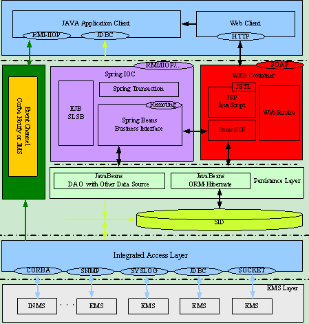 展現(xiàn)層分為兩類用戶界面,一種是Java Application類胖用戶界面;另外一種是純HTTP Web瘦客戶界面。Java Application頁面用于實現(xiàn)拓撲管理等現(xiàn)階段不易于采用Web技術(shù)實現(xiàn)的交互頁面,與其他各層的交互協(xié)議主要采用RMI-IIOP或JDBC。