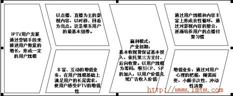 IPTV產業(yè)的發(fā)展,前期是通過其中的特殊功能來吸引用戶,如時移等,但之后,真正能吸引用戶的其中的某項業(yè)務。這在IPTV的宣傳策略上需要重視。