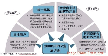 2008年,IPTV市場,因為發(fā)展速度明顯慢于了市場進度和技術演進。因此在原有的運營商產業(yè)化推動形勢下,終端廠家推動下的產品化發(fā)展模式也會得到更大的發(fā)展空間,而這在一定程度上雖會推動用戶對IPTV的認知度,同時也會分化一部分IPTV產業(yè)化的動力。