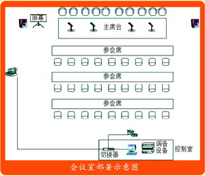 中大型會議室約在150~250平米,一般為教室型布局,即主要人員和領導在主席臺就座,參會人員在臺下就坐,這種情況的布局和設備放置的情況如圖所示。