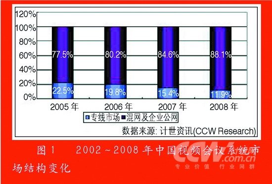 從市場結(jié)構(gòu)上看,混網(wǎng)及Internet軟件視頻會(huì)議系統(tǒng)市場已經(jīng)形成了對(duì)專線市場的主導(dǎo)地位的挑戰(zhàn),僅2004年,專線市場就比2003年下降了19.5個(gè)百分點(diǎn),到2005年混網(wǎng)及企業(yè)公網(wǎng)市場份額達(dá)到77.5%,而在2006年,混網(wǎng)及Internet視頻會(huì)議系統(tǒng)已經(jīng)達(dá)到80.2%的市場占有率,基本占據(jù)了市場的主導(dǎo)地位。