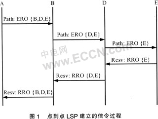 Switching Path)建立的信令過程。當入口標記交換路由器(LSR:Label Switching Router)A接收到一個業(yè)務請求后,它根據路由控制模塊計算出來的路由填寫顯示路由對象(ERO:Explicit