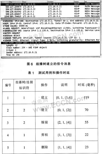 1出發(fā)的組播樹和單播連接,結果如表1所列。圖6顯示了Ethereal捕獲的組播樹建立的信令消息。在解開的Path消息中,可以發(fā)現經過擴展的UNI組播對象。然后,對已存在的連接進行了動態(tài)的修改。在第三個測例中,一個葉子被添加到單播連接上并使其變?yōu)橐豢媒M播樹。在嫁接和剪枝的操作中,業(yè)務生成器在已建立的連接上沒有觀察到丟包的現象。