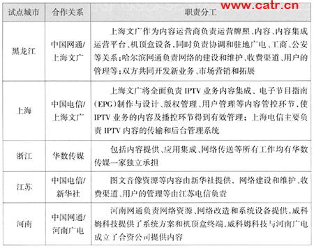 從業(yè)務(wù)參與角度來看,電信行業(yè)方面所開展的業(yè)務(wù)一般都是與其它行業(yè)合作的。表1是典型IPTV試點(diǎn)城市合作方與職責(zé)分工情況。