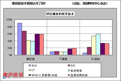 這是調(diào)查美國客服中心的管理者們?nèi)绾卧u價自己公司引進(jìn)技術(shù)的統(tǒng)計表。雖然“滿意”并不意味著“相關(guān)技術(shù)被有效利用”?墒菑恼{(diào)查結(jié)果來看,他們對技術(shù)的滿意度相當(dāng)高,并且看起來都在有效利用相關(guān)技術(shù)。