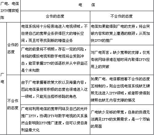 電信、廣電雖然都想爭奪IPTV的主導地位,但通過博弈矩陣可以看出,電信和廣電的互相滲透將是打造成熟的IPTV產(chǎn)業(yè)鏈的必然。廣電運營商具有內(nèi)容優(yōu)勢,電信運營商擁有交互技術(shù)和網(wǎng)絡(luò)。廣電網(wǎng)絡(luò)的條塊分割決定了廣電運營商豐富的內(nèi)容資源一旦脫離了電信的IP網(wǎng)絡(luò),就很難抓住IPTV的機會;而電信運營商的網(wǎng)絡(luò)資源沒有內(nèi)容,也會遭遇發(fā)展瓶頸,惟有廣電和電信合作競爭才是IPTV產(chǎn)業(yè)走向健康發(fā)展的現(xiàn)實選擇。
