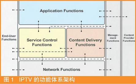最終的IPTV的體系架構(gòu)與第六次會議的體系架構(gòu)沒有太大的差別,只是在細(xì)微之處進(jìn)行了細(xì)化和完善。IPTV的功能體系架構(gòu)包含7個(gè)部分:端用戶功能、應(yīng)用功能、業(yè)務(wù)控制功能、內(nèi)容分發(fā)功能、網(wǎng)絡(luò)功能、管理功能和內(nèi)容提供功能,如圖1所示。