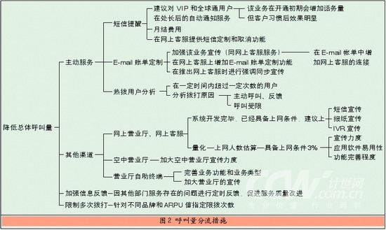 在給某移動運營商進行的接通率優(yōu)化咨詢項目中,利用呼叫中心接通率優(yōu)化模型進行了分析,圖2是針對分流呼叫中心總體呼叫量所提出的建議措施。