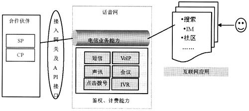 用戶不再是直接通過(guò)電話終端使用話音應(yīng)用,而是通過(guò)PC(或PDA等)在互聯(lián)網(wǎng)應(yīng)用中使用話音業(yè)務(wù),因此操作界面非常友好,互聯(lián)網(wǎng)應(yīng)用在后臺(tái)通過(guò)調(diào)用電信業(yè)務(wù)平臺(tái)的接口能力使用話音網(wǎng)絡(luò)資源能力,這些網(wǎng)絡(luò)資源能力包括VoIP、點(diǎn)擊撥號(hào)、短信、多方會(huì)議、聲訊、IVR等,因此話音網(wǎng)資源借助豐富的互聯(lián)網(wǎng)應(yīng)用激發(fā)了潛力。