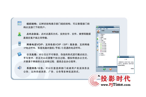 Center運營架構為基礎,有效整合了企業(yè)的如電話、傳真、手機、短信、E-mail、即時通訊等各種常用的通信設備和媒體應用,并進行統(tǒng)一管理、計劃及協(xié)同,是一套集即時通訊、網(wǎng)絡電話、點對點會議、多方視頻會議、遠程教學、遠程監(jiān)控、組織結構等為一體的桌面融合辦公系統(tǒng),能夠全面滿足企業(yè)遠程的日常交流、會議培訓、協(xié)同辦公、商務談判、指揮調(diào)度、安全保衛(wèi)等各種需求。