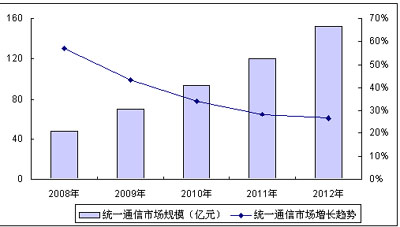 統(tǒng)一通信作為一種以融合技術(shù)為基本特征的特定解決方案和應(yīng)用,通過對各種溝通方式進行有效的融合,滿足用戶方便快捷的信息獲取和溝通需求,近年來在全球范圍內(nèi)得到了迅猛發(fā)展,各大通信與信息技術(shù)相關(guān)廠商紛紛加入統(tǒng)一通信市場的競爭中。賽迪顧問數(shù)據(jù)統(tǒng)計顯示,2008年上半年,中國統(tǒng)一通信整體市場規(guī)模已達到21.01億元,同比增長超過60.9%,繼續(xù)保持強勁的增長勢頭。
