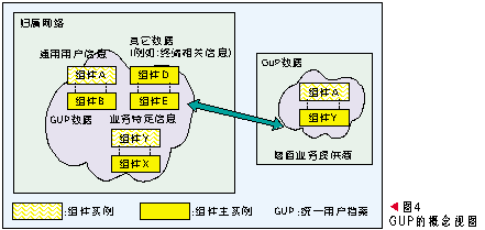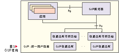 GUP中一個用戶相關(guān)的數(shù)據(jù)由多個數(shù)據(jù)組件構(gòu)成,每個組件又可以包含多個數(shù)據(jù)單元。在網(wǎng)絡(luò)中用戶數(shù)據(jù)每個數(shù)據(jù)組件只有一個主實例,但是可以有多個復(fù)制實例。用戶數(shù)據(jù)以組件為單元可以存放在不同的網(wǎng)絡(luò)實體中,應(yīng)用可以通過統(tǒng)一的訪問入口以標準接口訪問所有授權(quán)的數(shù)據(jù),這個入口功能由GUP