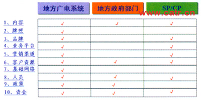 在投資與收益方面,雙方共同出資,成立公司,調(diào)動雙方相關(guān)的優(yōu)勢資源。并且協(xié)調(diào)了與SP/CP、政府、行業(yè)部門等多方面原本復(fù)雜的關(guān)系。能夠增加的收入是點播和直播節(jié)目收費。收費模式方面增加電視包月費、頻道組合費。合作分成通過股份公司分紅。