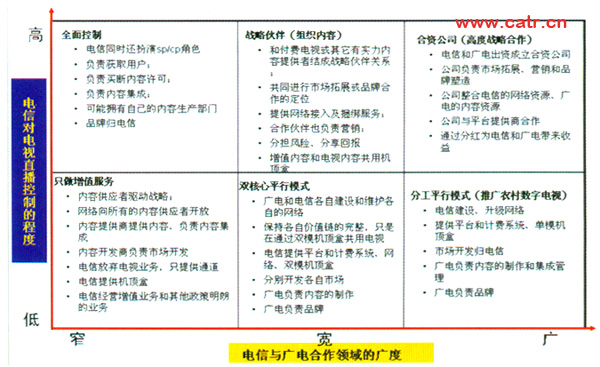 這種模式的合作點主要在接入層面,以提供雙模機頂盒為主要方法。固網(wǎng)公司和廣電發(fā)揮各自資源優(yōu)勢進行合作。廣電節(jié)目傳送由廣電負責(zé),同網(wǎng)提供寬帶增值服務(wù),兩者分業(yè)經(jīng)營,地位平等。
