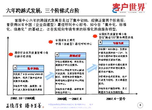 六年的跨越式發(fā)展,走過了集中初始,規(guī)模運(yùn)營兩個階段。曾經(jīng)獲得也是今天主辦方的06年中國(企業(yè)自建型)最佳呼叫中心稱號。如今在集中化、標(biāo)準(zhǔn)化、信息化的基礎(chǔ)上,正在向?qū)>專席標(biāo)準(zhǔn)化的熱線服務(wù)轉(zhuǎn)型。