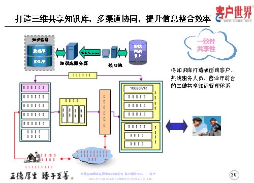 打造三維共享知識庫,多渠道協(xié)同,提升信息整合效率。我們的知識庫服務(wù)器是基于客戶系統(tǒng)的大平臺,形成熱線服務(wù)人員、營業(yè)廳人員,乃至客服經(jīng)理的三維共享知識庫共享,以保障了服務(wù)的一致性,服務(wù)渠道的共享性。