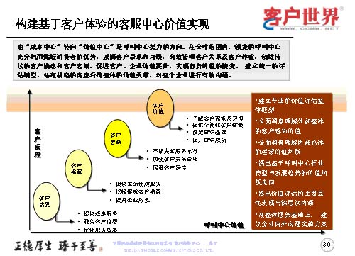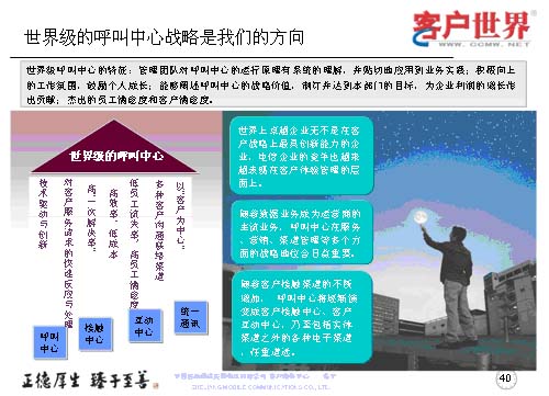 最后我想世界級的呼叫中心戰(zhàn)略是我們從事客戶服務(wù)行業(yè),從事呼叫中心人的方向,從我們理解的世界級呼叫中心特征來講,管理團(tuán)隊?wèi)?yīng)對呼叫中心的運(yùn)營原理有系統(tǒng)的理解,并貼切地應(yīng)用到業(yè)務(wù)實踐,創(chuàng)造積極向上的工作氛圍,鼓勵員工成長,能夠闡述呼叫中心的戰(zhàn)略價值,制訂并達(dá)到本部門的目標(biāo),為企業(yè)利潤的增長作出杰出的貢獻(xiàn),杰出的員工滿意度和客戶滿意度。所以世界級呼叫中心我們理解是從七個方面來衡量,以“客戶為中心”,多種客戶溝通的聯(lián)絡(luò)渠道,低員工流失率和高客戶滿意度,高效率、低成本,高“一次性解決率”,對客戶服務(wù)請求的快速反應(yīng)與處理,技術(shù)驅(qū)動與創(chuàng)新。