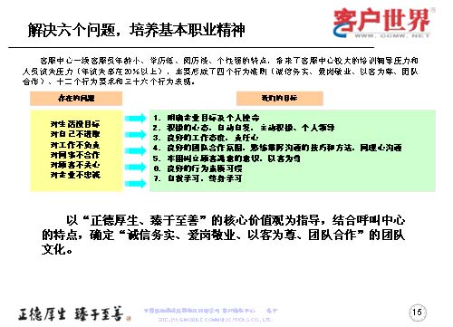 一線客服人員如何來全面提升職業(yè)能力,首先是解決一線客服人員的六個問題,剛才已經(jīng)跟大家交流了客服中心一線人員的人員結(jié)構(gòu),當(dāng)前的六個主要問題可以用簡單的幾個方面來表述:對生活沒有明確的目標(biāo)、對自己不進(jìn)取、對工作不負(fù)責(zé)、對同事不合作、對顧客不關(guān)心、對企業(yè)不忠誠,這是在日常工作中,一線人員所存在的問題。而針對這些問題,我們要用工作目標(biāo)去持續(xù)解決和克服問題,所以我們采取的是讓大家明確企業(yè)目標(biāo)與個人使命,用積極的心態(tài)自主自發(fā),主動積極和個人領(lǐng)導(dǎo);良好的工作態(tài)度責(zé)任心,良好的團(tuán)隊合作氛圍;熟練掌握溝通技巧和方法,牢固樹立顧客滿意的意識,以客為尊;良好的行為素質(zhì)習(xí)慣,自我學(xué)習(xí),終身學(xué)習(xí)。從而在中國移動集團(tuán)“正德厚生、臻于至善”的核心價值觀指導(dǎo)下,結(jié)合呼叫中心特點(diǎn),確定誠實務(wù)信,愛崗敬業(yè),以客為尊、團(tuán)隊合作的團(tuán)隊文化。