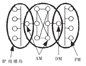 在采用混合式組播的IP視頻會(huì)議中,與會(huì)成員組成如圖1所示的拓?fù)浣Y(jié)構(gòu)。在每個(gè)IP組播島內(nèi),與會(huì)成員之間的數(shù)據(jù)傳輸使用IP組播,并選定一個(gè)與會(huì)成員作指定成員(Designate Member,DM),把島內(nèi)除DM外的與會(huì)成員稱為其他成員(Pertinent Member,PM),DM是島內(nèi)成員與島外成員之間通信的橋梁。島外成員與DM參加應(yīng)用層組播疊加網(wǎng)[5](包括一個(gè)控制拓?fù)浜鸵粋(gè)數(shù)據(jù)拓?fù)?的構(gòu)建,將其稱為應(yīng)用層組播成員(ALM Member,AM),AM之間的數(shù)據(jù)傳輸使用應(yīng)用層組播。IP組播島中PM通過DM與疊加網(wǎng)相連,DM與島外成員之間的數(shù)據(jù)傳輸采用應(yīng)用層組播方式,與島內(nèi)的成員之間的數(shù)據(jù)傳輸使用IP組播的方式。DM負(fù)責(zé)將來自疊加網(wǎng)的數(shù)據(jù)以IP組播方式傳送給組播島中PM,PM的數(shù)據(jù)也通過IP組播方式傳送到DM,由DM以應(yīng)用層組播的方式發(fā)送給疊加網(wǎng)上的其他與會(huì)成員。