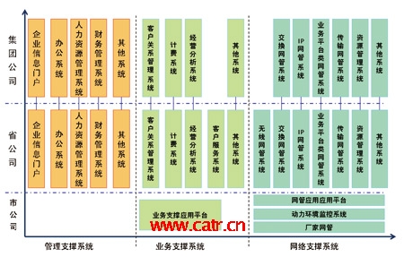 從系統(tǒng)部署來看,目前各大運(yùn)營企業(yè)都以集團(tuán)與省公司為主要的建設(shè)與管理維護(hù)單位,建成了集團(tuán)與省兩級(jí)模式的支撐系統(tǒng)。集團(tuán)公司的系統(tǒng)主要提供面向全公司的企業(yè)管理、經(jīng)營分析等功能;省公司從職能管理單位逐步轉(zhuǎn)向了兼顧管理、生產(chǎn)的單位,具有了越來越多的生產(chǎn)職能,在運(yùn)營支撐系統(tǒng)建設(shè)中的作用較為突出,一般情況下,在遵循集團(tuán)公司的總體指導(dǎo)思想下,可自行規(guī)劃與建設(shè)本省的支撐系統(tǒng);市公司的生產(chǎn)職能有所削弱,主要負(fù)責(zé)市場(chǎng)營銷、客戶支撐以及設(shè)備的現(xiàn)場(chǎng)維護(hù)等工作,因而主要是支撐系統(tǒng)的使用單位。
